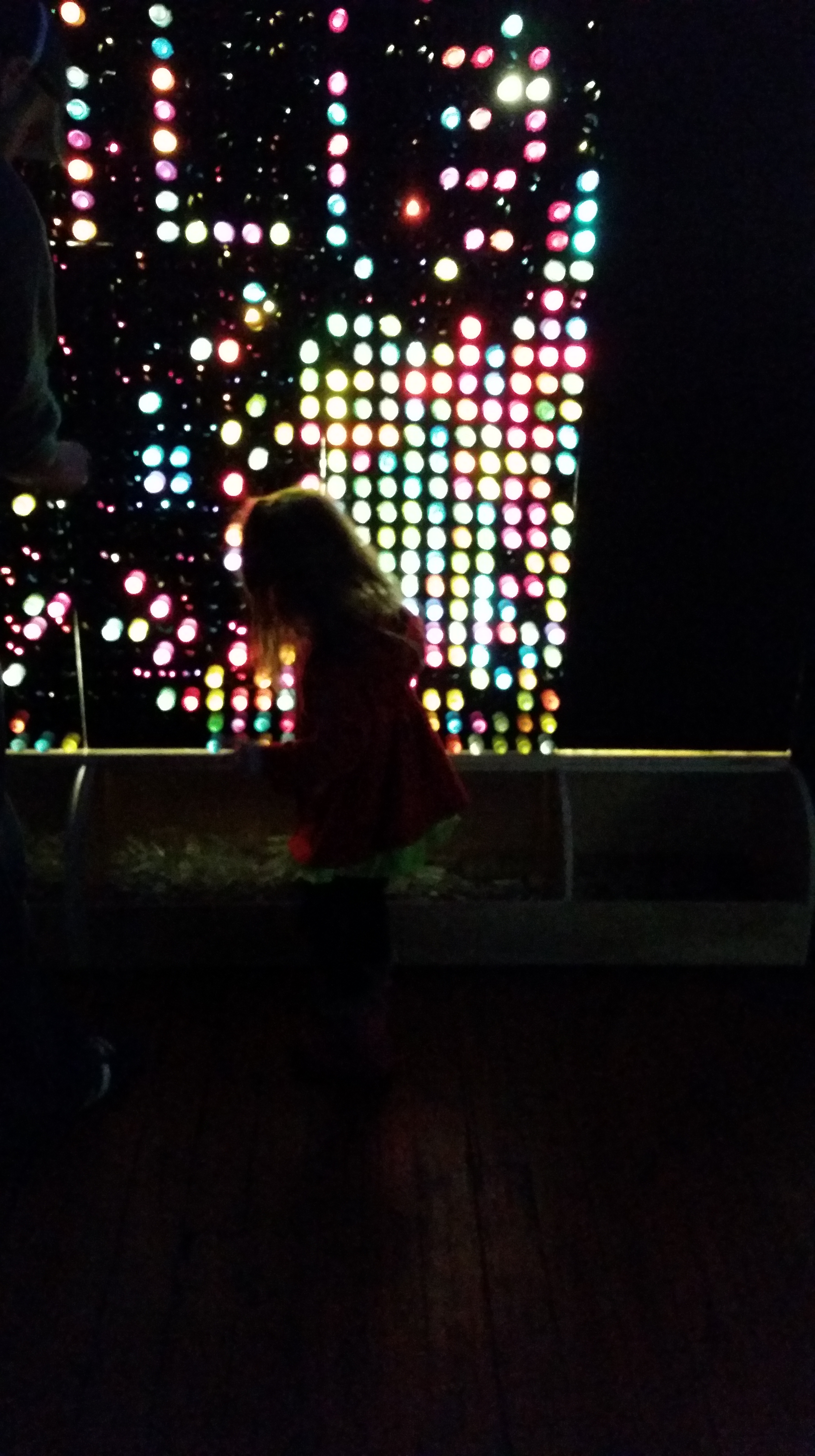 We took Toddler Grouch to a museum not that long ago and they had a vertical wall full of holes, and huge colored plastic pegs you could push into them to create any pattern or shape you desired. I snapped a photo of her and it looked like this: